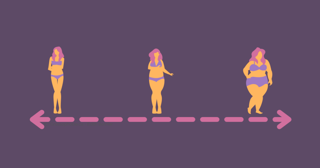 Or, quand une personne de taille « standard » se déclare grosse, elle contribue à affecter ce spectre de la grosseur. Elle vient occuper la partie où l’on retrouve les personnes réellement, techniquement grosses… Ceci a pour effet de décaler vers l’extrémité – voire d’éjecter – les personnes grosses et très grosses de leur partie du spectre.